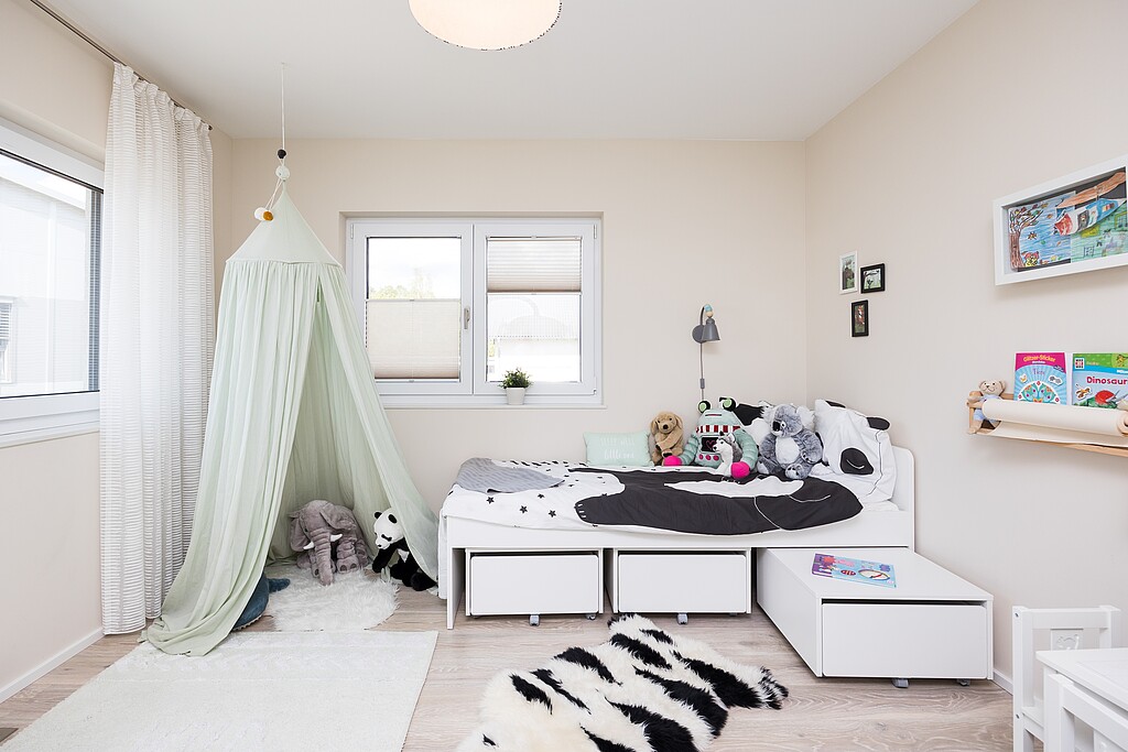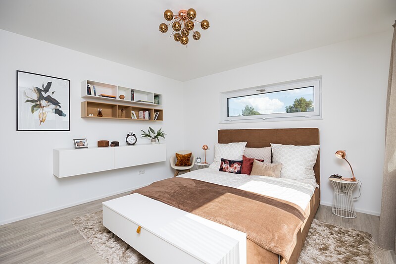 À l'étage, les changements apportés au plan de base ne sont que mineurs, car avec les deux grandes chambres d'enfants, la chambre principale avec dressing et la salle de bains extrêmement spacieuse, qui offre même de la place pour un sauna si vous le souhaitez, elle répond en l'état déjà aux souhaits les plus importants en matière d'habitat. Avec la maison d'exposition Villa 178 à Oberleichtersbach, nous montrons quelles sont les variantes disponibles en plus d'un sous-sol complet ou d'une dalle de fondation. Pour ceux qui ne souhaitent pas se lancer dans la construction d'un sous-sol complet, mais qui désirent tout de même pouvoir y cacher les installations techniques domestiques et un espace de stockage pour les provisions, un sous-sol partiel est une alternative rentable.