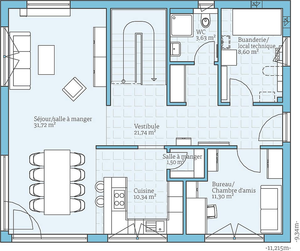 Dans les maisons disposant de beaucoup d'espace au sol, un sous-sol complet serait souvent trop grand et générerait un espace inutile. En déplaçant les installations techniques domestiques au sous-sol, de la place est ainsi libérée au rez-de-chaussée pour une petite pièce qui combine buanderie/vestiaire, où l'on peut par exemple ranger la machine à laver, le placard à balais, les chaussures ou les sacs.