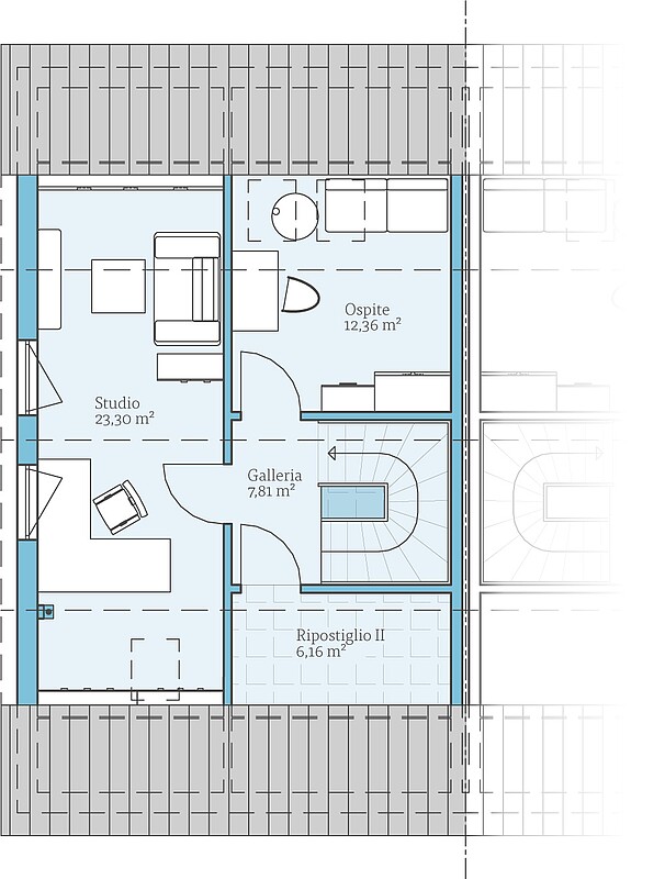 La casa Doppelhaus (bifamiliare) 176 offre una quantità veramente generosa di spazio sui suoi due piani pieni e nella mansarda ulteriormente utilizzabile. La planimetria di 176 m², adatta all'uso quotidiano e alla famiglia, offre una vasta gamma di possibili usi. Oltre ai soggiorni al piano terra e alle camere da letto al piano superiore, ci sono altre stanze disponibili nella mansarda, che possono essere utilizzate, per esempio, come terza camera per bambini, come studio/camera degli ospiti o come locale per gli hobby. C'è anche spazio per un ripostiglio. Opzionalmente, il design della casa può essere esteso con una tettoia per la porta d'ingresso, che protegge la zona d'ingresso dal vento e dalle intemperie.