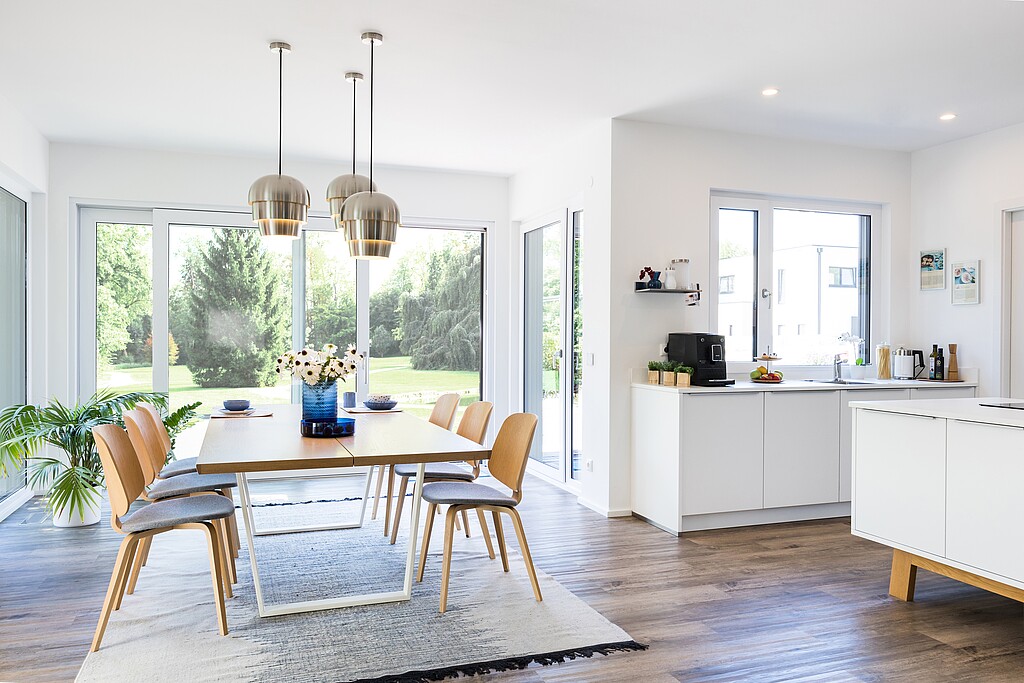- Un'estensione del tetto piatto a un piano consente di avere più spazio per il tavolo da pranzo di circa 4,5 m² e una migliore vista all'esterno.