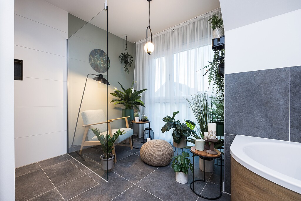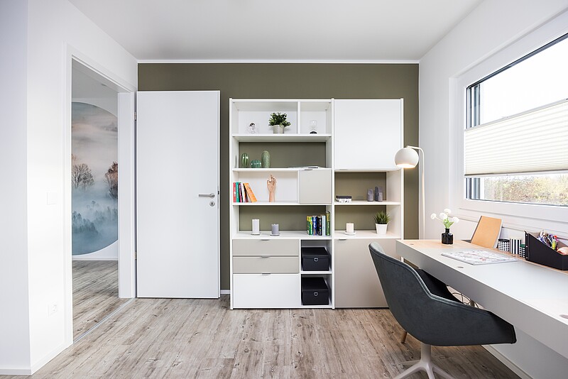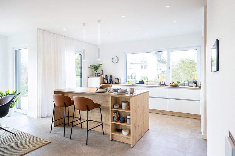 Particolarmente pratico: In un locale aggiuntivo che si collega direttamente alla cucina aperta, è progettata una combinazione di dispensa e lavanderia. In questo modo si possono ridurre le distanze da percorrere in casa.