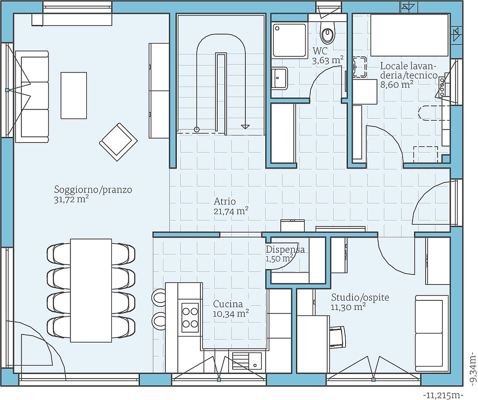Il locale tecnico trasferito nel seminterrato crea spazio al piano terra per un piccolo locale combinato, dove, per esempio, si possono riporre la lavatrice, l'armadio delle scope, le scarpe o le borse.