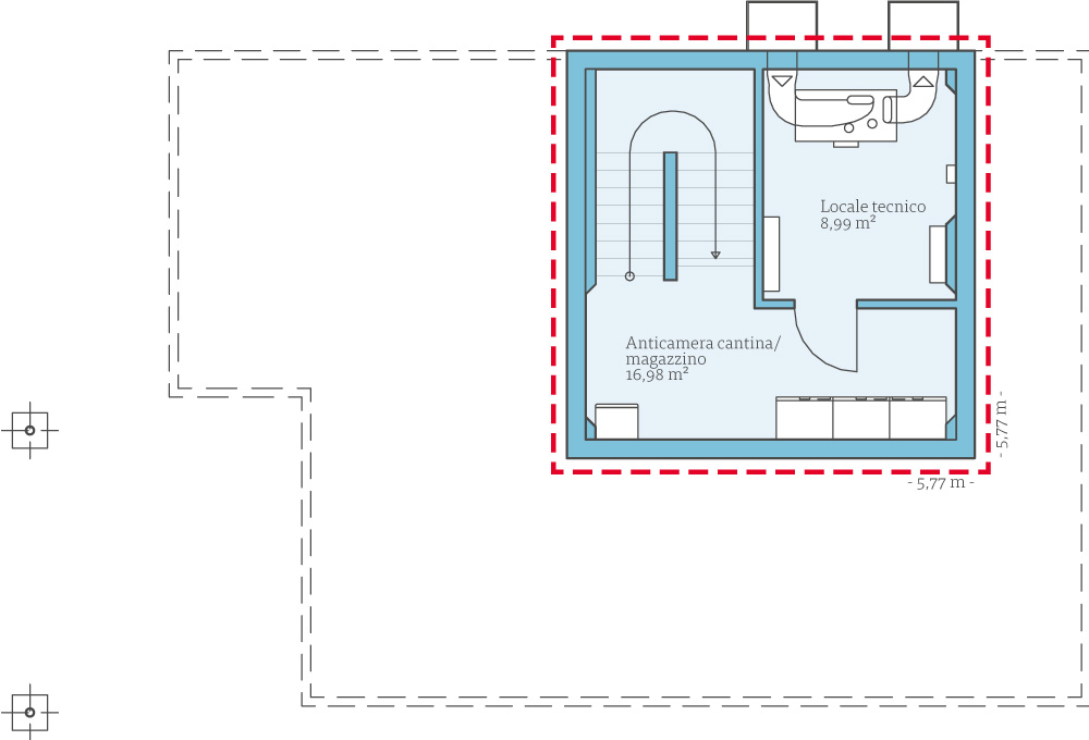 - La cantina parziale offre circa 26 m² di spazio per il locale tecnico e per spazio di stoccaggio.